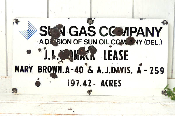 USAアメリカで実際に使われていた、【SUN GAS COMPANY.....SUN OIL COMPANY.. MARY BROWN, A-40&A.J.DAVIS, A-259 197.42 ACRES 】ホーロー製サインです。