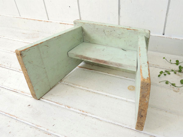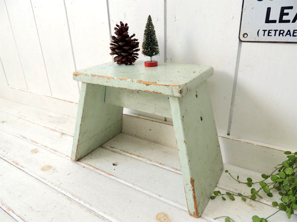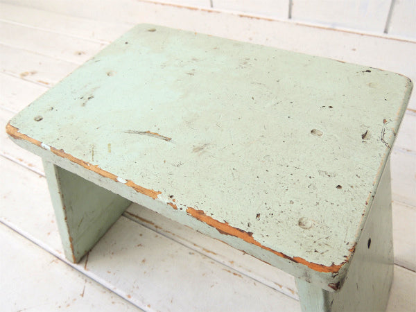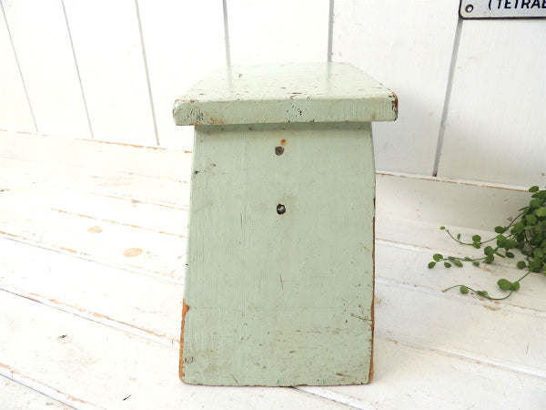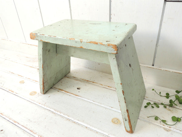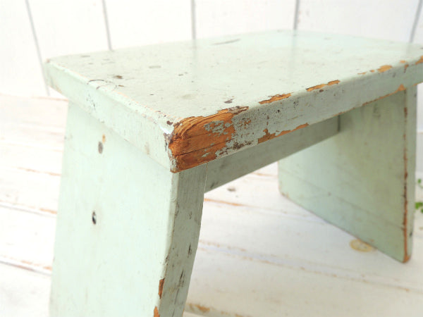カリフォルニア州・ロサンゼルスの旧家で見つけました・・ミントグリーン色のペンキの剥げた木製・アンティーク・踏み台(スツール/ローチェア)です。