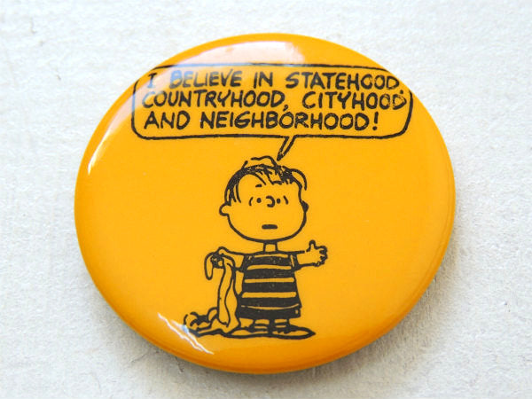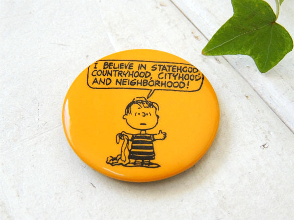 アメリカ南部・テキサス州で見つけました・・1964's メッセージ付き『I BELIEVE IN STATEHOOD COUNTRYHOOD,...』ライナスのヴィンテージ・缶バッジです。