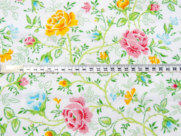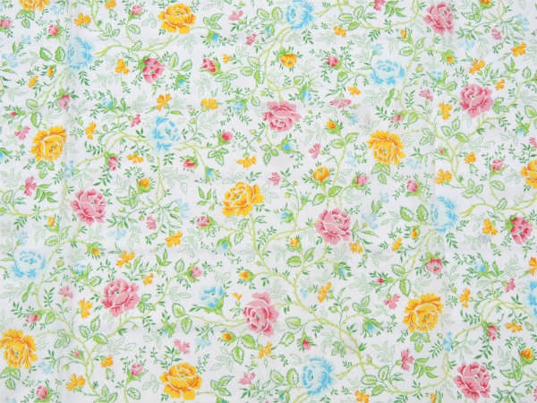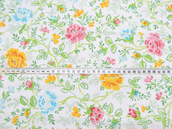 ホワイトベースに、ピンク×黄色×水色の花柄&リーフ柄プリントです。