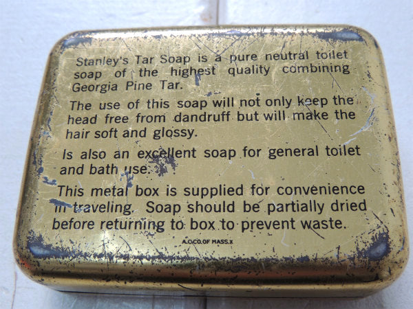 ゴールドトーンのブリキ製で、上部に【STANLEY'S TAR-ZODANDRUFF REMOVER TAR SOAP FOR SHAMPOO AND GENERAL TOILET USE /JOHN T. STANLEY CO.,INC. NEW YORK, N.Y.】と文字が入っています。