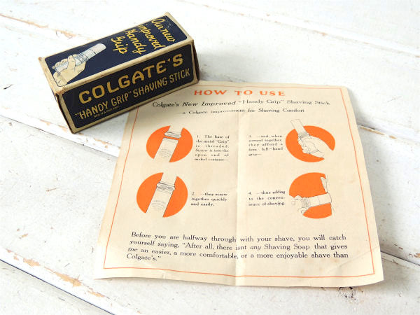 アメリカ南中部・オクラホマ州で見つけました・・歯磨き粉でお馴染み『COLGATE(コルゲート)』のデッドストック未使用・ヴィンテージ・“HANDY GRIP”シェービング・スティックです。