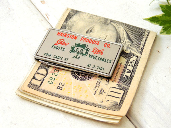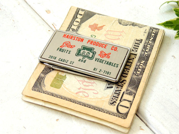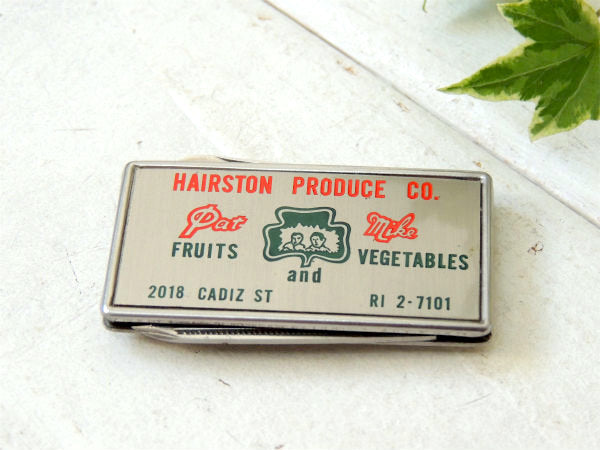 アメリカ南部・テキサス州で見つけました・・”HAIRSTON PRODUCE CO.・pat mike ・FRUITS and VEGETABLES”ヴィンテージ・ポケットナイフ&マネークリップ(ナイフ&ヤスリ付き)です。 ミニナイフには【STAINLESS STEEL JAPAN】と刻印がございます。 カバンやお財布を持ち歩かない方でも、お札をたたんでクリップで挟みポケットに入れていただくと、スッキリとズボンに収納できます。 マネークリップ・・アウトドア&キャンプ・・プレゼントなどに・・♪ 美品ですが、経年による多少のスリキズ等ございます。 米ドル札は付いておりません。 画像(写真)でのご判断を宜しくお願い致します。 ■SIZE :約 W5.2cm×D3.3cm×H0.7cm   ■コンディション : ★★★★☆ ■レターパックライト¥360対応可(追跡サービスあり・補償なし) ※ご注文の際、お手数ですがメッセージ欄に『レターパックライト希望』とご記入下さい。新たにお見積もりをメールにてお知らせさせていただきます。