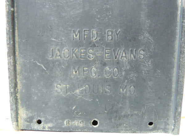 取っ手下に【U.S MAIL APPROVED BY THE POSTMASTER-GENERAL】のエンボス+アドレス&ネームシール付き、背面に【MFD.BY JACKES-EVANS MFG.CO. ST.LOUIS.MO/8-79】とエンボス文字が入っております。