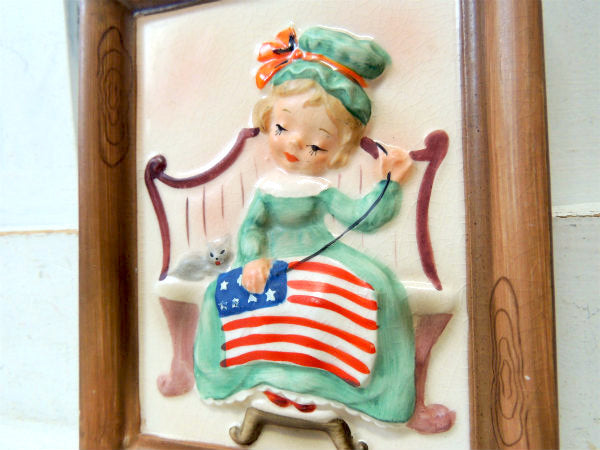 フレームはウッド模様、ベッドに座って星条旗を縫っているベッツィーと猫の立体デザインで、ハンドペイントで絵付けが施された、素敵なお品です。