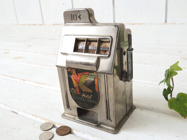 スロットマシンの形をしたオモチャの貯金箱で、ラスベガスのホテル【THUNDERBIRD(サンダーバード)】の紙ラベルが付いており、ミッドセンチュリー時代のクールなデザインです。