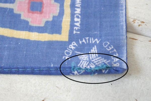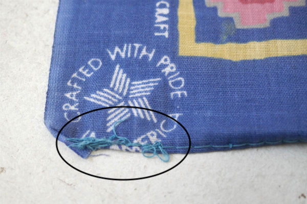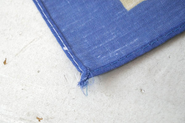 アメリカ西海岸・カリフォルニア・ロサンゼルスで見つけました・・メイドインUSA『Wamcraft』のヴィンテージ・バンダナです。 1980年代 デッドストック・未使用品 MADE IN U.S.A. ネイティブアメリカンのシンボル、トライバル柄デザインです。 カラーリングは、マットなブルー×ピンク×クリームイエロー×グレー×赤茶色の6色です。 コットン50%・ポリエステル50%製です。 首や手首・腰に巻いてファッションのアクセントや、ヘアバンドなどのヘアアレンジにもオススメです! アクセサリー&インディアンジュエリーを置いたり・・木製フレーム&額縁に入れてオリジナルアート・・店舗ディスプレイなどに・・♪ デッドストック未使用品ですが、角の糸のホツレ箇所がございます。 画像(写真)でのご判断を宜しくお願い致します。 ■SIZE :約 W57cm×H55cm   ■コンディション : ★★★★☆ ■レターパックライト¥370対応可(追跡サービスあり・補償なし) ※ご注文の際、お手数ですがメッセージ欄に『レターパックライト希望』とご記入下さい。新たにお見積もりをメールにてお知らせさせていただきます。