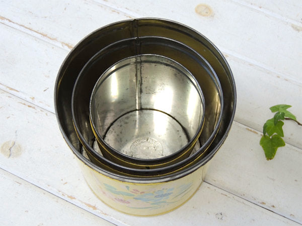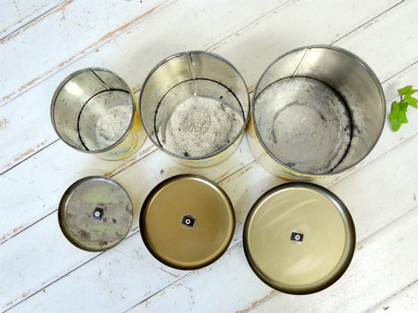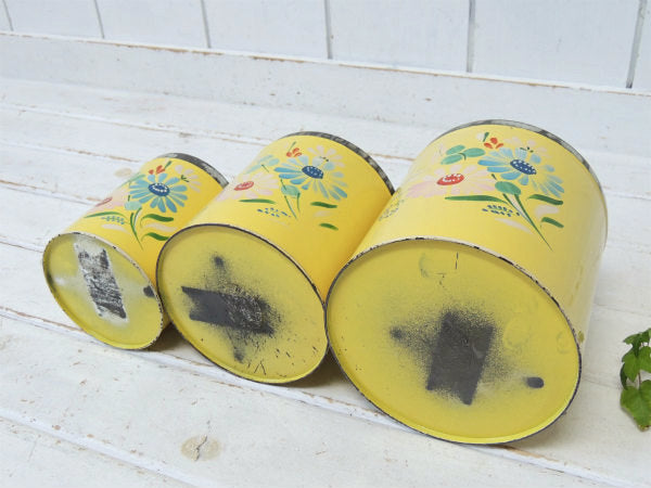 アメリカ南部・テキサス州で見つけました・・ハンドペイントで人気の高い『ランズバーグ(Ransburg)社』の入れ子式・メタル製・アンティーク・キャニスター3個セットです。