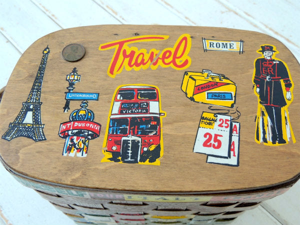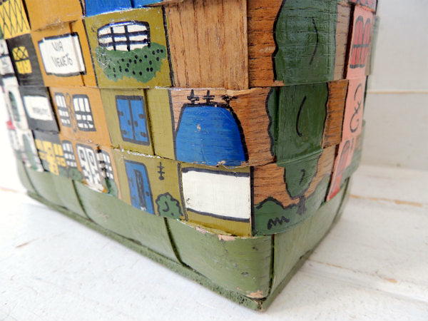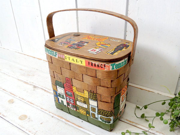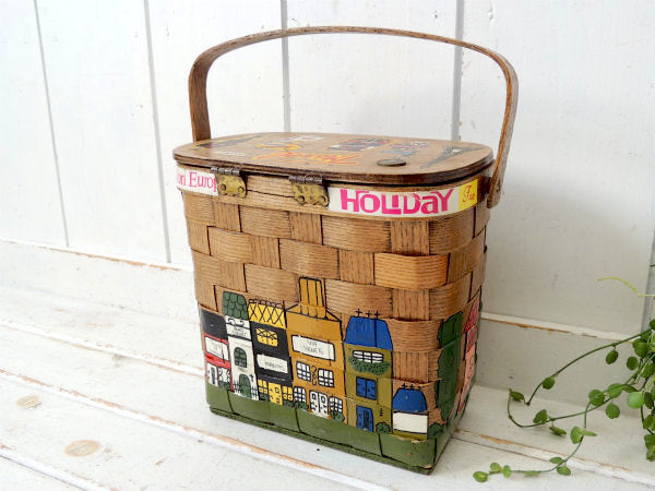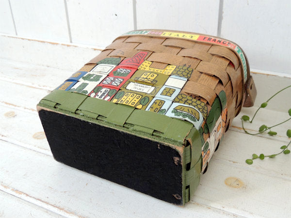 アメリカでも人気の高いコレクターアイテムで、カラフルなイギリス&フランス&イタリアのヨーロッパの可愛い町並みがハンドペイントで描かれた、木製バスケットです。