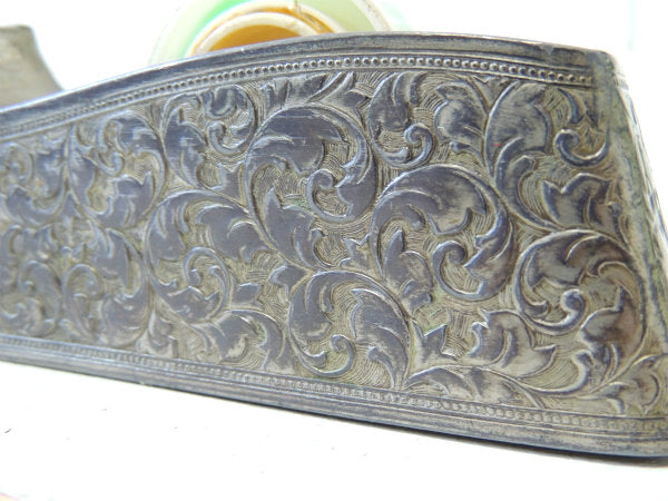 シルバープレートの表面に、フローラル&リーフ柄の細やかなエンボスが施された、素敵なヴィクトリアンデザインです。