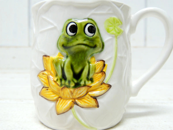 白色のセラミック製カップの側面に、睡蓮のリーフ柄のエンボス&イエローの睡蓮の花の上にカエルがちょこんと座っています。