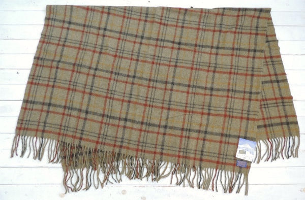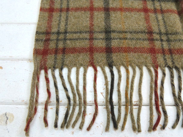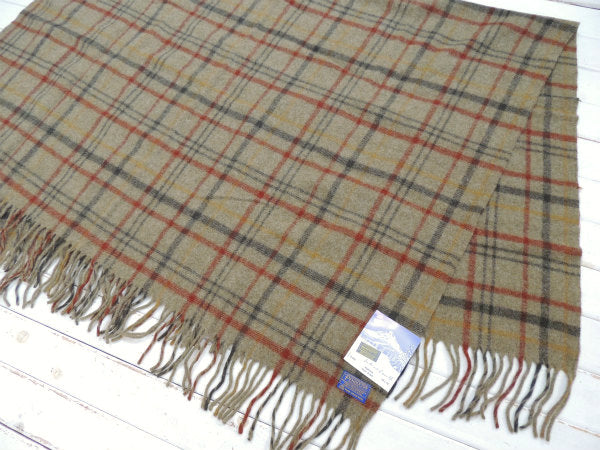 上質なピュアヴァージンウール100%製、ブラウン色のチェック柄、上下にフリンジ付き。