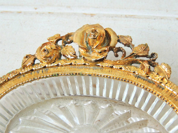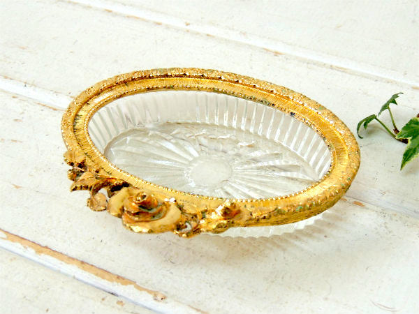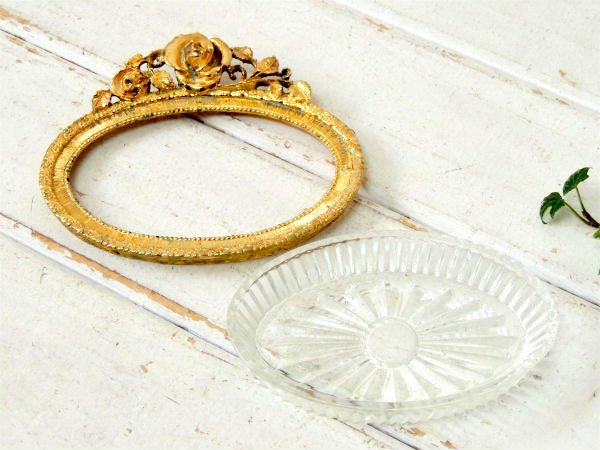 メタルフレームの表面はゴールドメッキ加工が施され、上部に薔薇モチーフがあしらわれており、トレイ部分はお花のエンボス模様が施されたクリアガラス製です。