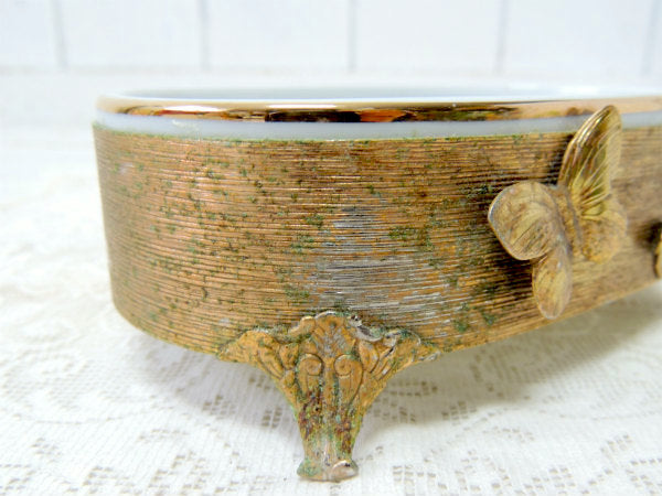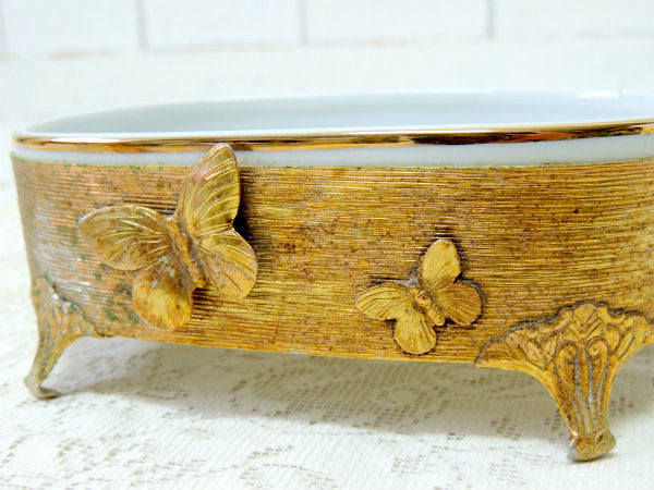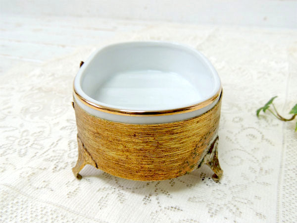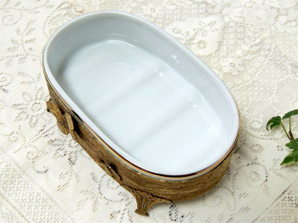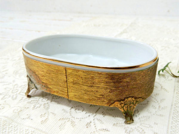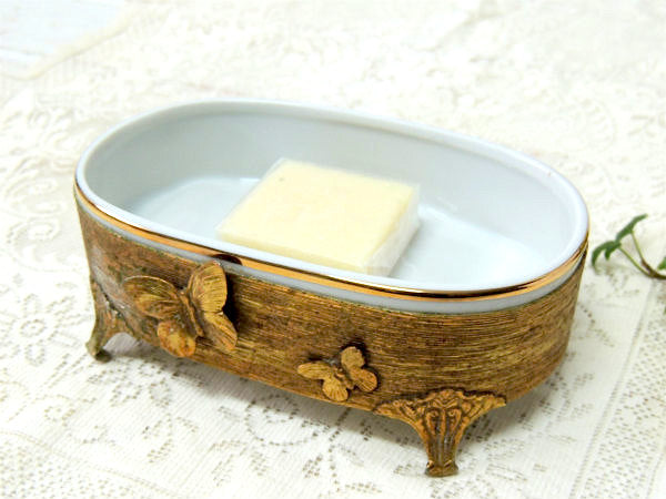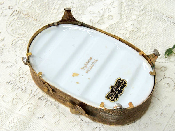 アメリカ西海岸・サンフランシスコの古家で見つけました・・『Stylebuilt』のゴールドフレーム×陶器製・ヴィンテージ・脚付きソープディッシュ(石鹸置き)です。