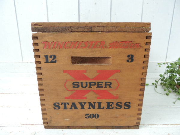 両面に【SMALL ARMS AMMUNITION LOADED SHOT SHELLS / MADE IN U.S.A. /WINCHESTER. Western /Winchester Repeating Arms Co. / NEW HAVEN, CONN., U.S.A.】、両サイドに【WINCHESTER. Western /12 3 SUPER X /STAYNLESS 500 】、フタにカウボーイのイラスト&【WINCHESTER. Western】の文字プリントが入っています。