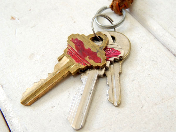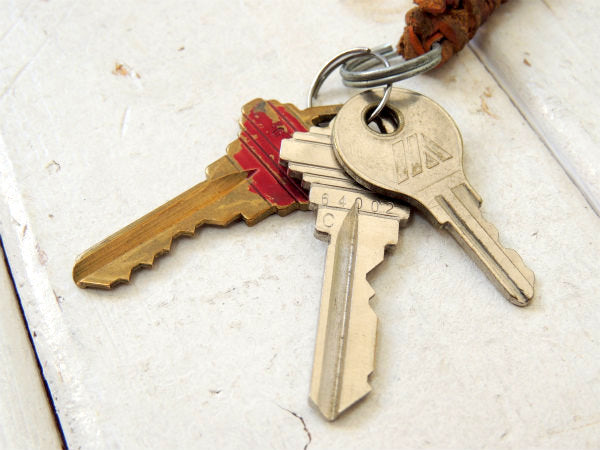 アメリカ西海岸・カリフォルニア サンディエゴで見つけました・・ヴィンテージ・3本鍵&使い込まれた・編み込み・革・レザー付き(キーホルダー)です。