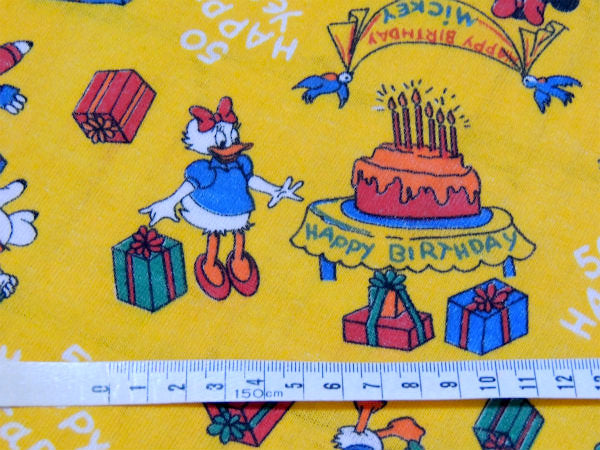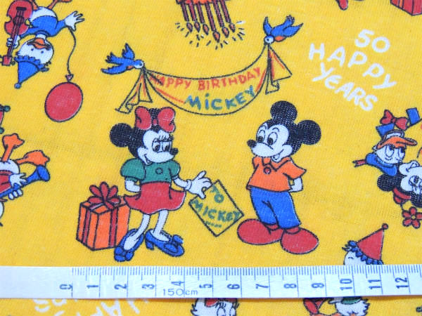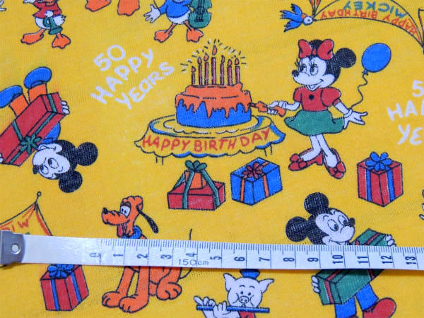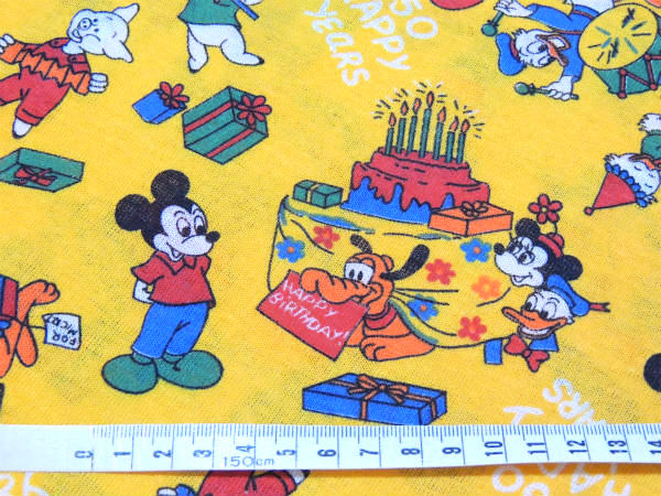 イエローベースに【50 HAPPY YEARS】【HAPPY BIRTHDAY MICKEY】の文字、ミニーマウス&プルート&ドナルドダック&デイジーダック&3匹のこぶた&ヒューイ・デューイ・ルーイなどのミッキ&フレンズの仲間たちが、ミッキーのお誕生日をお祝いしている、とっても可愛いプリントです!