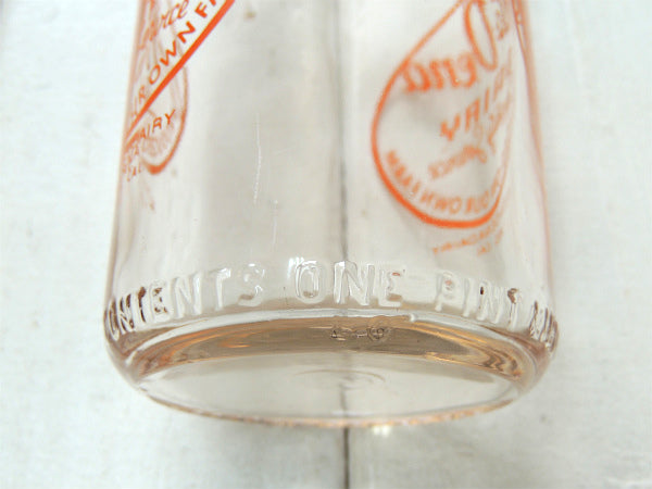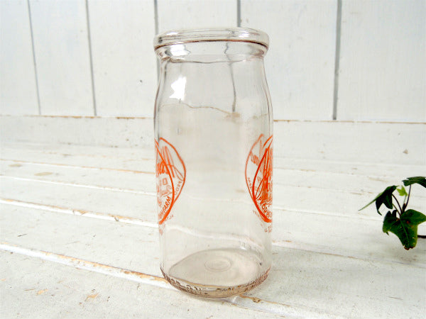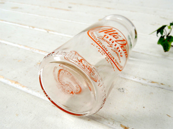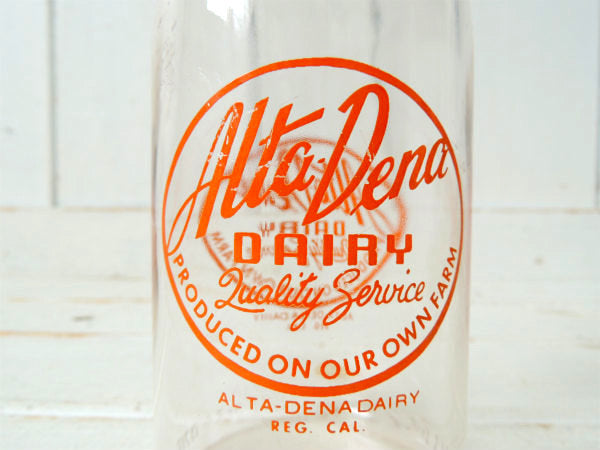1パイントサイズ(約473ml)の丸い筒型ガラスボトルに、【Alta-Dena DAIRY Quality Service PRODUCED ON OUR OWN FARM /ALTA-DENA DAIRY REG. CAL.】のオレンジ色ロゴが両面にプリントされております。