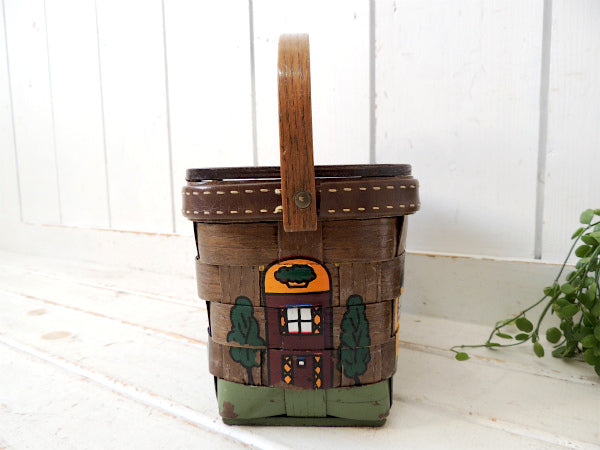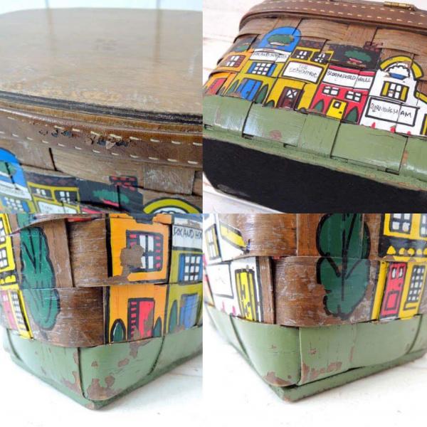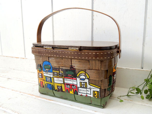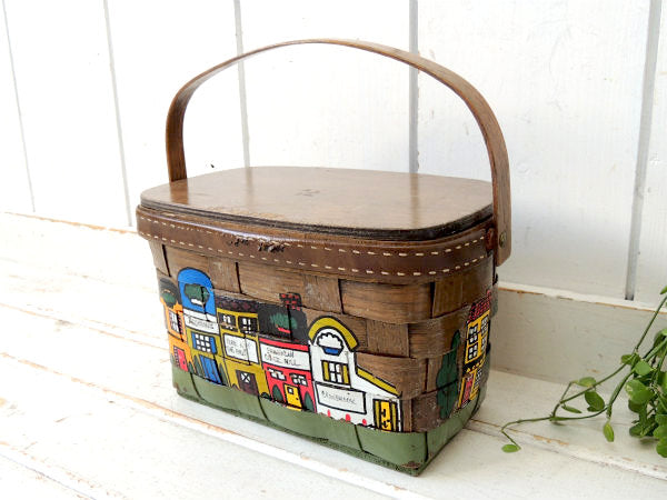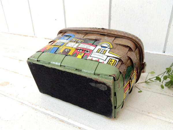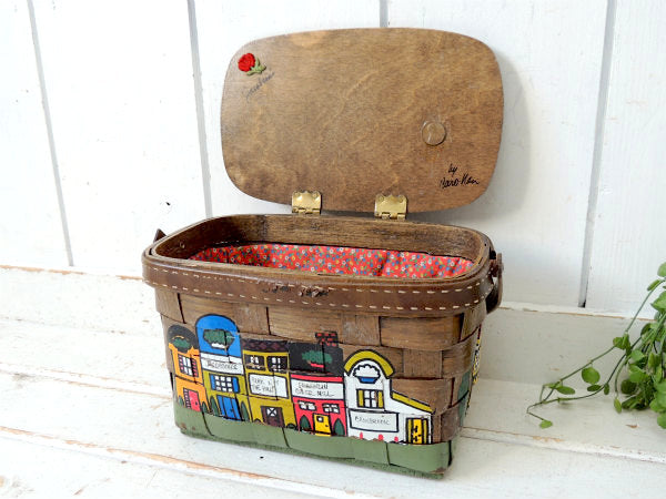 アメリカでも人気の高いコレクターアイテムで、カラフルな可愛い町並みがハンドペイントで描かれた、木製バスケットです。