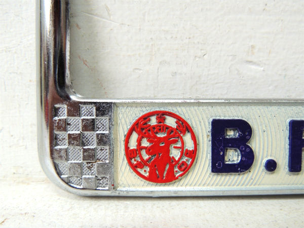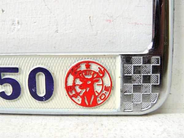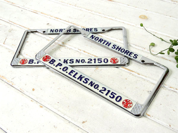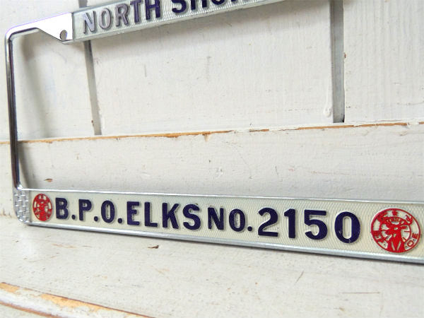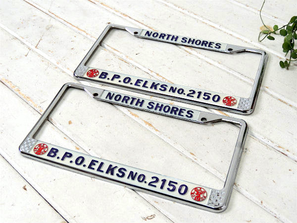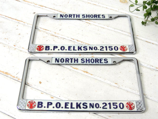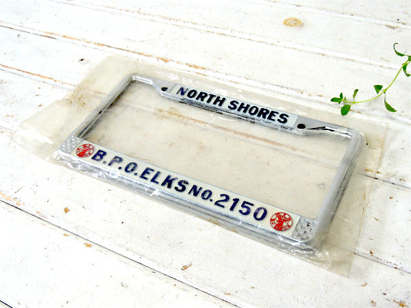 ノースショア”NORTH SHORES・B.P.O.ELKS・No.2150”アメ車・ナンバープレート用・フレーム(ナンバーフレーム)チェッカーフラッグ&トナカイ柄。