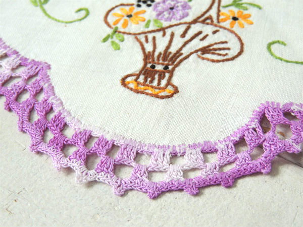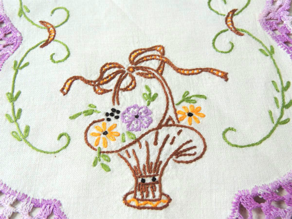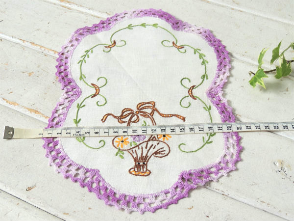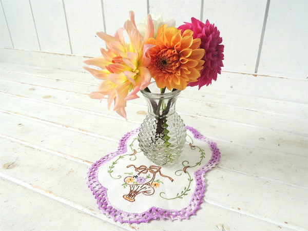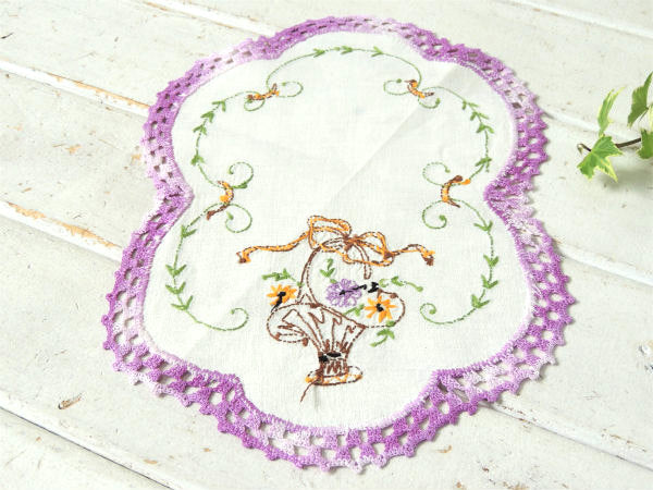 フラワーバスケット柄 刺繍 クロッシェレース デッドストック アンティーク ドイリー USA