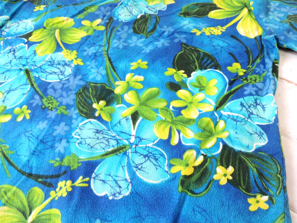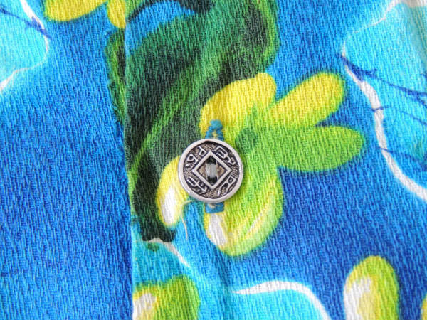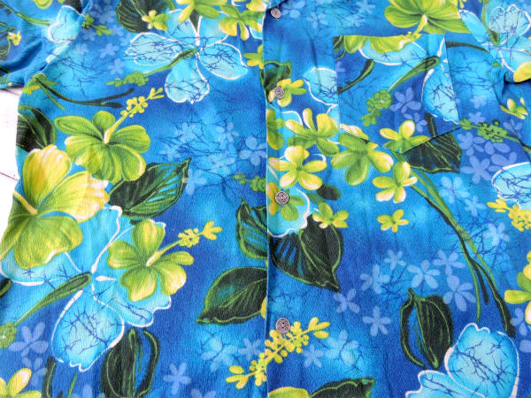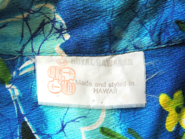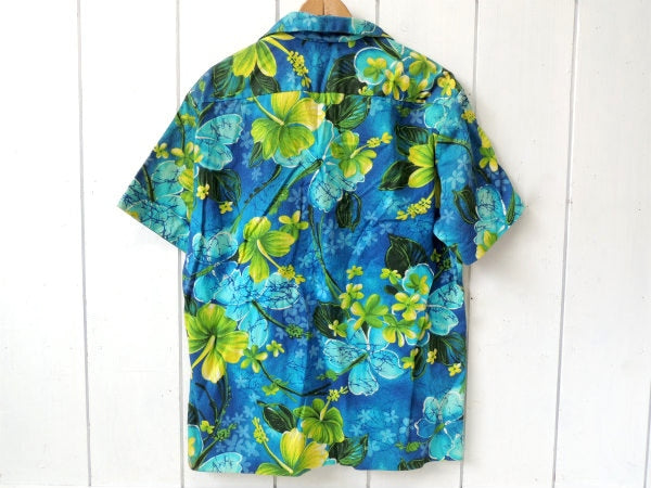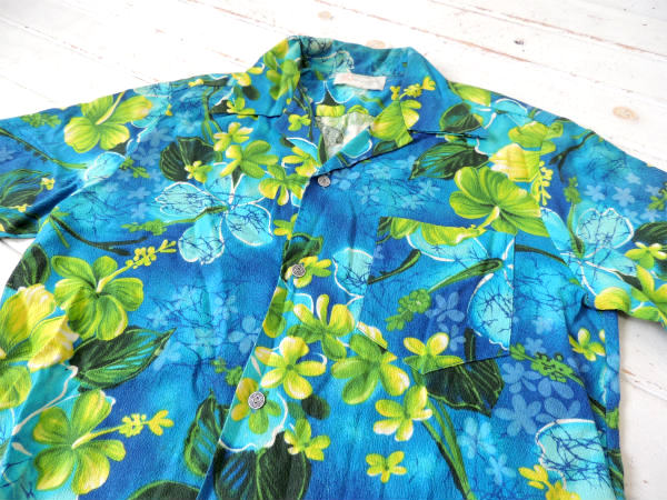 ”ROYAL HAWAIIAN"古銭ボタン・ヴィンテージ・アロハシャツ・ハワイアンシャツ・個性ある総柄デザイン(花柄・ハイビスカス柄・ブルー・グリーンetc)