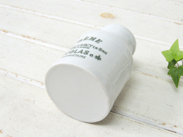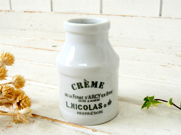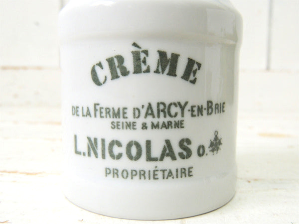 ミルク缶の形をしたホワイトボディに【CRÉME DE LA FERME D'ARCY- EN-BRIE SEINE&MARNE / L.NICOLAS 0. PROPRIÉTAIRE】のグリーン色・フランス語の文字が入っています。