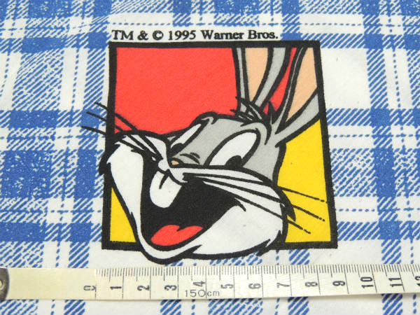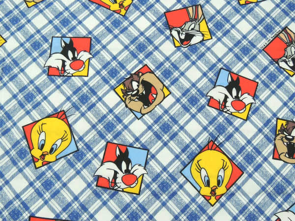 青×白色ベースの斜めチェック柄ベースに、ルーニーテューンズの人気キャラクター【バックスバニー】【トゥイーティー】【シルベスター】【タスマニアデビル】のパネル柄プリントです。