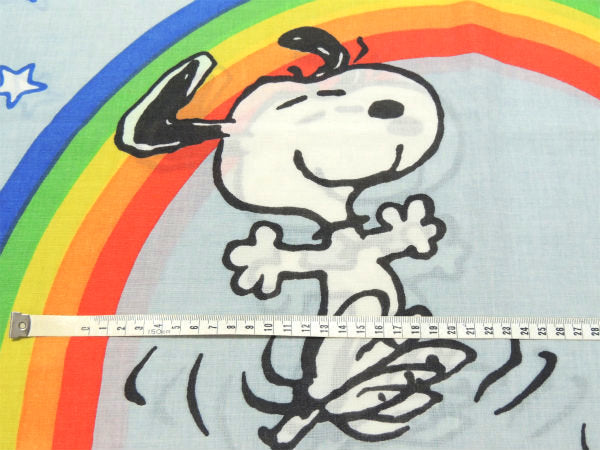 水色ベースに、大きなレインボー(虹)の下でスヌーピーとウッドストックが楽しそうにジャンプしている、カラフルキュートなプリントです。