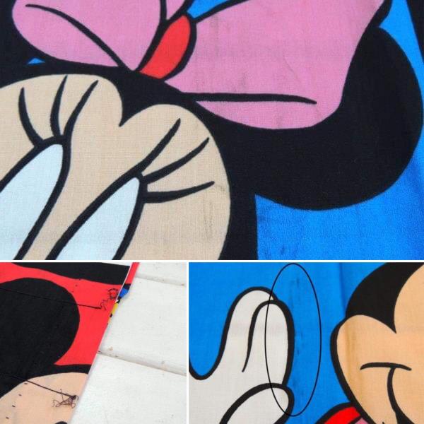 プリントの発色良く、生地もしっかりしておりますが、ミニーマウスの一部に薄いヨゴレ・端の糸ホツレが見られます。