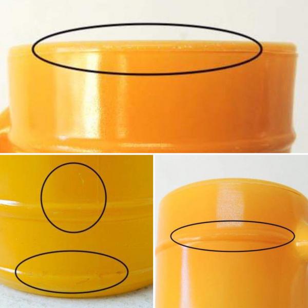 経年による多少の使用感、側面の2本ライン上とリム部分の数カ所にプリントロス、下部の数カ所にシルバースポット、ハンドルの数カ所にプリントロス、ボトム1箇所に約1.5㎝程のヒビが見られます。