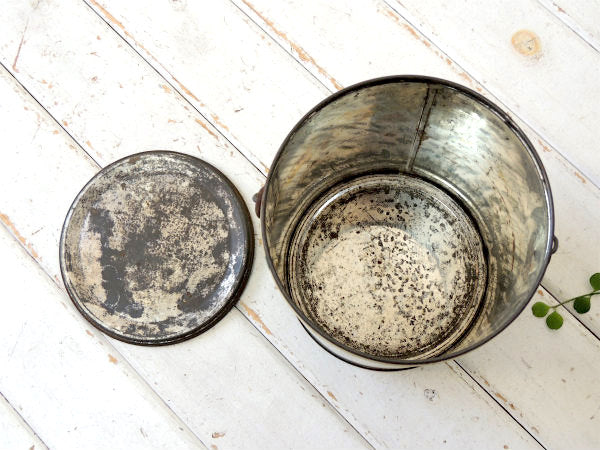 ベジタブル・ショートニング(ケーキなどに入れるバター、ラード)が入っていたハンドル付きのバケツ型・ブリキ缶です。