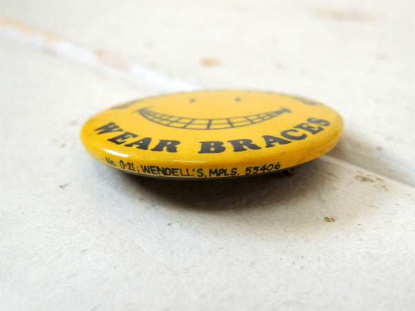 アメリカ西海岸・カリフォルニアで見つけました・・” スマイル・SMILING FACES WEAR BRACES ”ヴィンテージ・イエロー・缶バッジです。