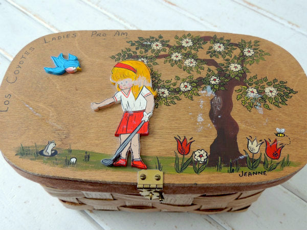 レトロな少女&ゴルフ柄・ハンドペイント・ヴィンテージ・木製バスケット・カゴバッグ・ハンドバッグ