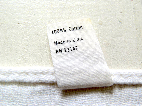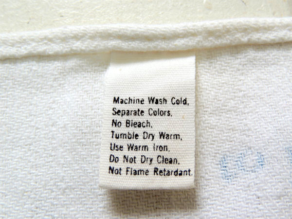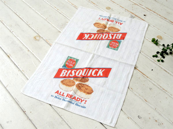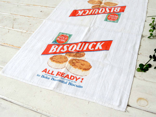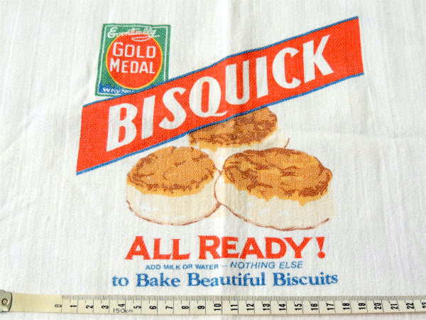 コットン100%のリネンの両サイドに【BISQUICK / ALL READY! /ADD MILK OR WATER-NOTHING ELES TO Bake Beautiful Biscuits】のカラープリントが施されています。