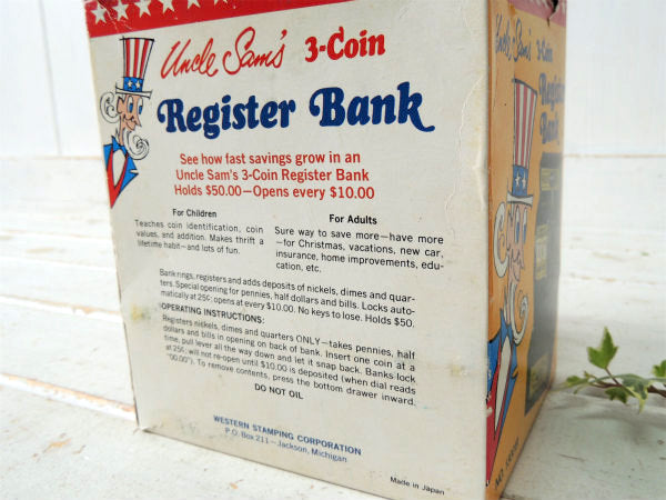 アメリカ中西部・シカゴで見つけました・・『WESTERN STAMPING CORPORATION』の【UNCLE SAM'S 3-Coin REGISTER BANK】アンクルサム・箱付き・ブリキ製・ヴィンテージ・コインバンク(貯金箱)です。