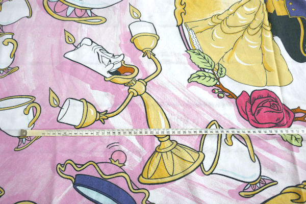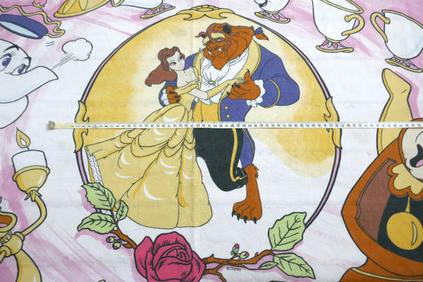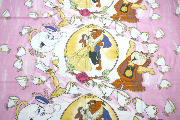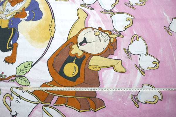 ダンスしている美女ベルと王子・ポット夫人・チップ・ルミエール・コグスワースなどの、メルヘンなピンク色ベースの大柄プリントです。