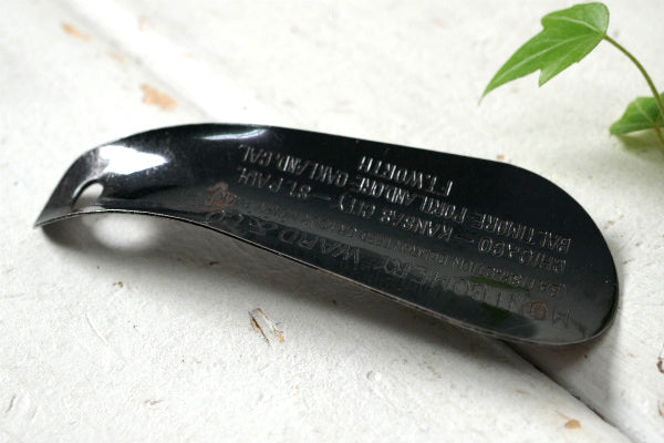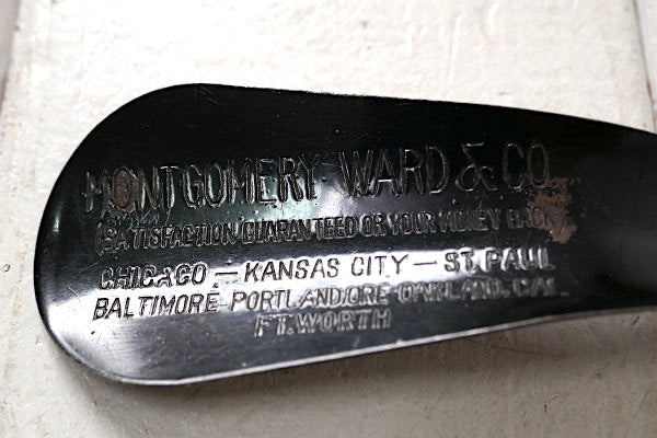 アメリカ合衆国・インディアナ州、インディアナポリス郊外で見つけました・・・シアーズと並ぶアメリカ3大ストアブランドの1つMontgomery Ward・モンゴメリーワード アドバタイジング・スチール製・ヴィンテージ・靴べら(シューホーン)です。