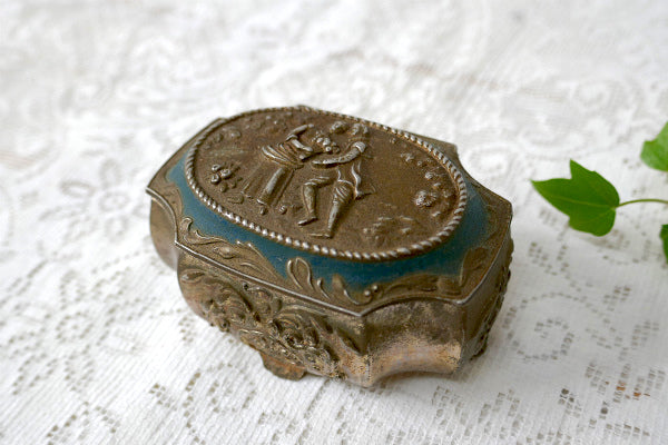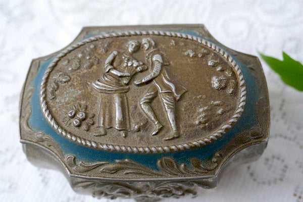 蓋に、ヴィクトリア朝の男性&花束を持った女性、蓋の回りと側面にはお花&リーフの細やかなエンボスが施され、エレガントな気品ある素敵なデザインです。