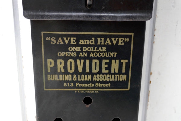 フロントにゴールドカラーで【“SAVE and HAVE” ONE DOLLAR OPENS AN ACCOUNT PROVIDENT BUILDING & LOAN ASSOCIATION 513 Francis Street / P.N. CO., FULTON, ILL.】の文字が入っています。