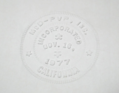 アメリカ西海岸・カリフォルニア州で見つけました・・”McD PVP INC.”アドバタイジング ・1977年・ヴィンテージ・カンパニーシール(エンボッサー)です。