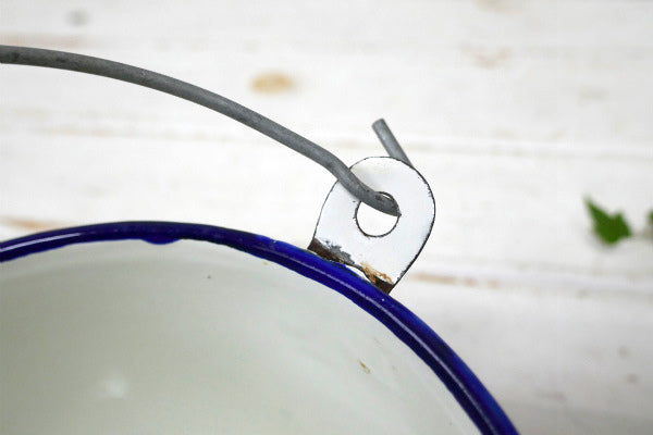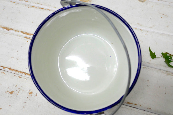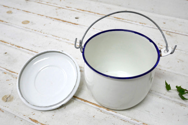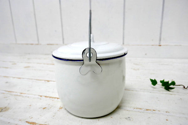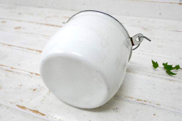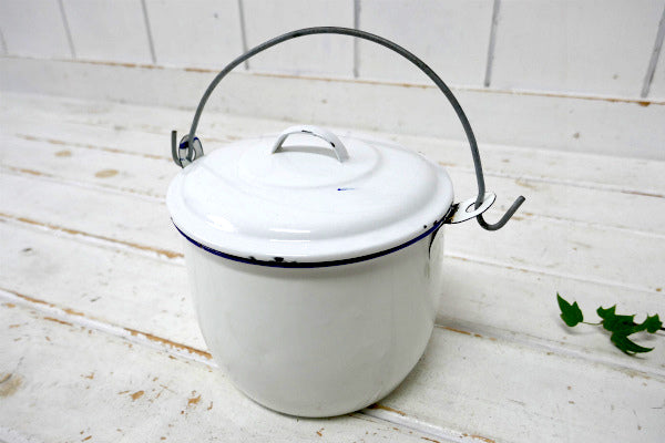 ホワイト・ハンドル付き・ヴィンテージ・ホーロー鍋・吊り鍋・クッキングポット・キャンプ・アウトドア