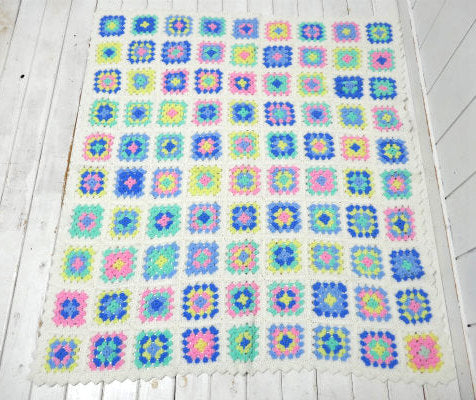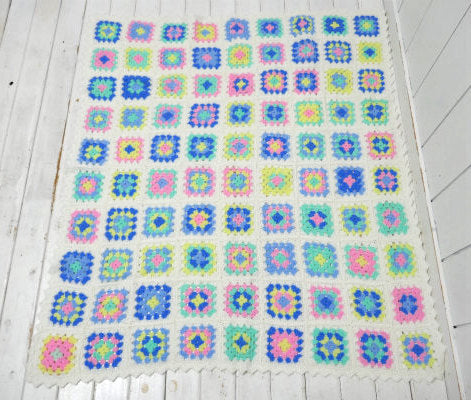 アメリカ中西部・シカゴで見つけました・・やさしいパステルカラーのモチーフ編み・ヴィンテージ・ニットブランケットです。