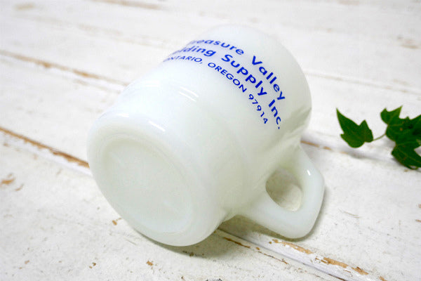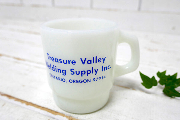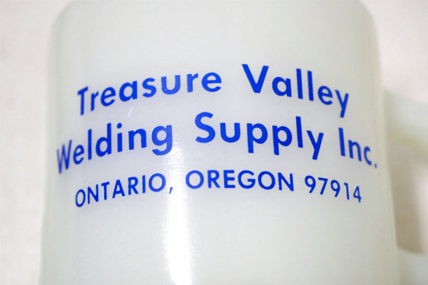 ホワイトベースのミルクガラスに、ブルー文字で【Treasure Valley Welding Supply Inc. ONTARIO, OREGON 97914】とプリントが入っています。