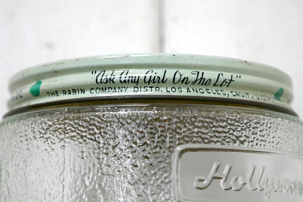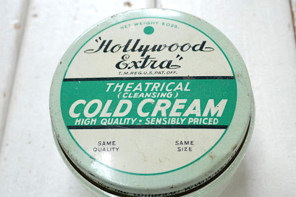 グリーン×アイボリーカラーのフタに【“Hollywood Extra” THEATRICAL(CLEANSING) COLD CREAM HIGH QUALITY・SENSIBLY PRICED】、フタ側面に【THE RABIN COMPANY DISTR. LOS ANGELES, CALIF. U.S.A. / No Make-Up Kit Complete Without It! / FOR PROFESSIONAL AND HOME USE】とたくさんの文字が入ったパッケージです。