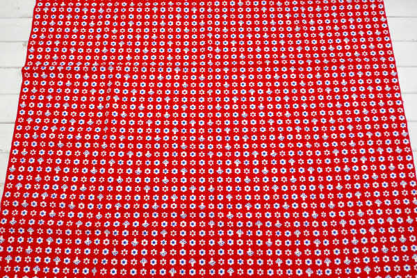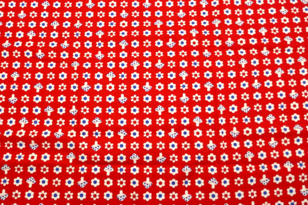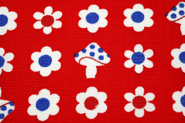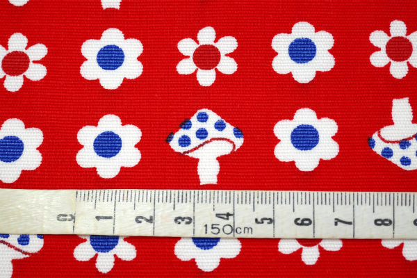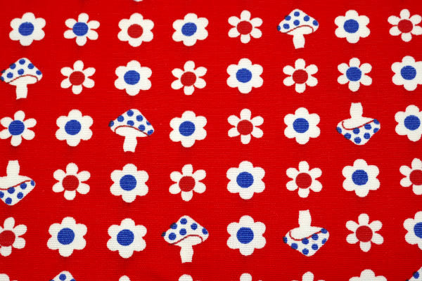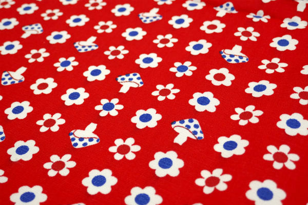 赤色ベースに、2色の小花柄&キノコ柄の、レトロポップな可愛い総柄プリントです。