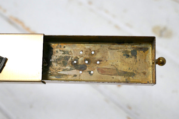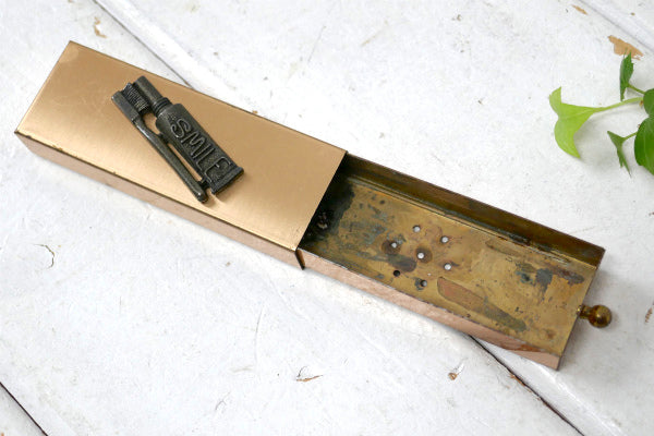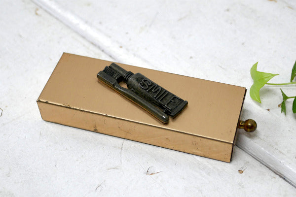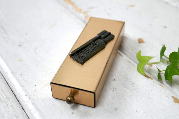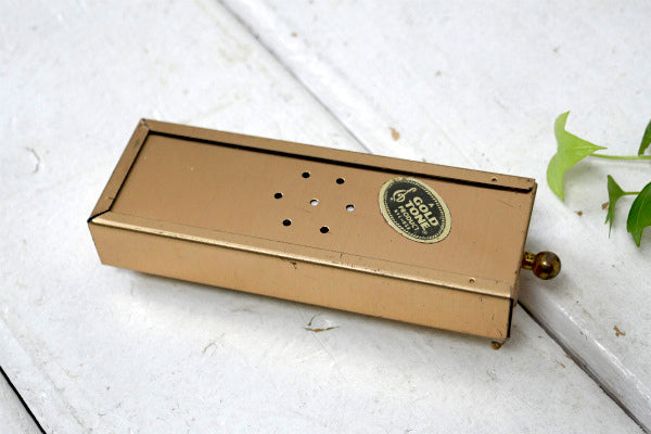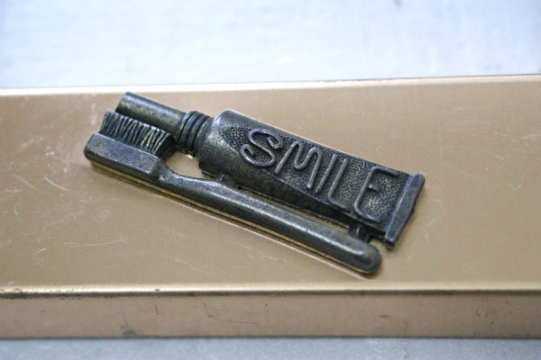 アメリカ西海岸・サンフランシスコで見つけました・・・『Gold Tone Product』のゴールドカラー・メタル製・ヴィンテージ・歯磨きセットです。 1950年代 トラベル用(携帯用)の歯ブラシ(MADE IN U.S.A.)&歯磨き粉が入った歯磨きセットです。 ゴールドトーンのメタル製ケースに、歯ブラシ&“SMILE”の文字入り歯磨き粉チューブの形の立体的な装飾が付いています。 内側ボトムに通気穴がございます。 ボトムのラベルに【A GOLD TONE PRODUCTS NYC-USA】とございます。 パウダールームやお部屋のインテリア・・コレクションなどに♪ 経年による多少のヨゴレ・スリキズ・サビ等ございます。 付属の歯ブラシ&歯磨き粉はご使用いただけません。 画像(写真)でのご判断を宜しくお願い致します。 ■size :約 W8.8cm×H2.8cm×W1.9cm ■コンディション : ★★★★☆ ■レターパックライト¥370対応可(追跡サービスあり・補償なし) ※ご注文の際、お手数ですがメッセージ欄に『レターパックライト希望』とご記入下さい。新たにお見積もりをメールにてお知らせさせていただきます。