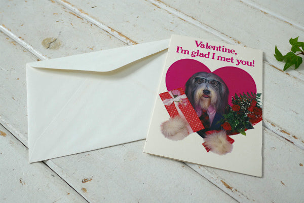 表紙は、【Valentine, I'm glad T met you!】の文字と、メガネをかけたスーツ姿の犬“オールド・イングリッシュ・シープドッグ”が、プレゼント&花束を持ったキュートなデザインです。
