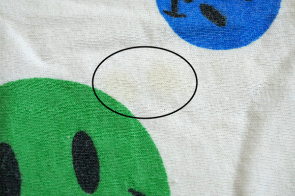 イエローやブルー・グリーン・レッドの可愛いスマイリーフェイスの総柄プリントです。