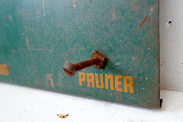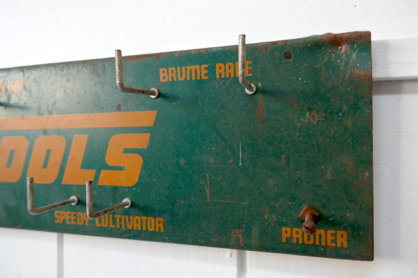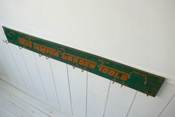 グリーンのメタル製サインに、オレンジ色で【TRUE TEMPER GARDEN TOOLS】の大きなロゴが入っており、【SHOVEL】【CULTIVATOR HOE】【RAKE】【GARDEN HOE】【BRUME RAKE】【TROWEL】【WEEEDER HOE】【SPADING FIRK】【GARDEN SPADE】【SPEEDY CULTIVATOR】【PRUNER】のツール名とフック全17個が付いております。